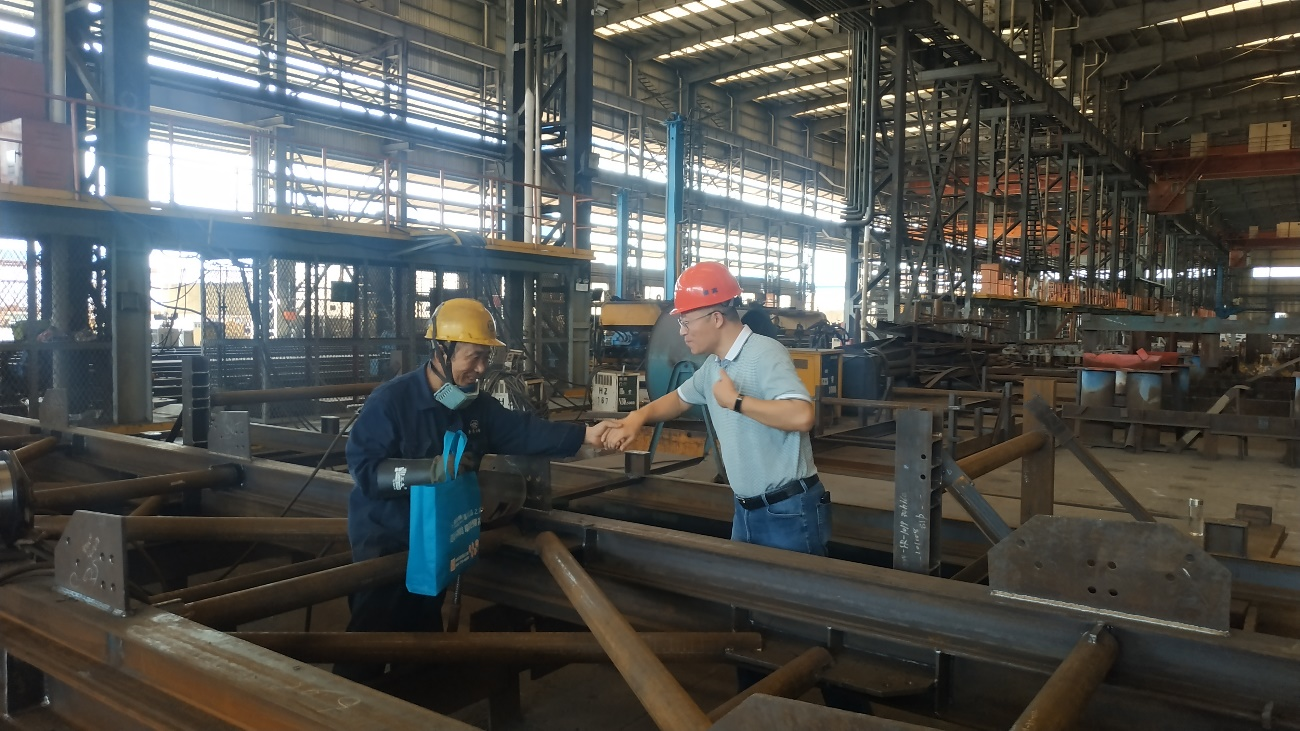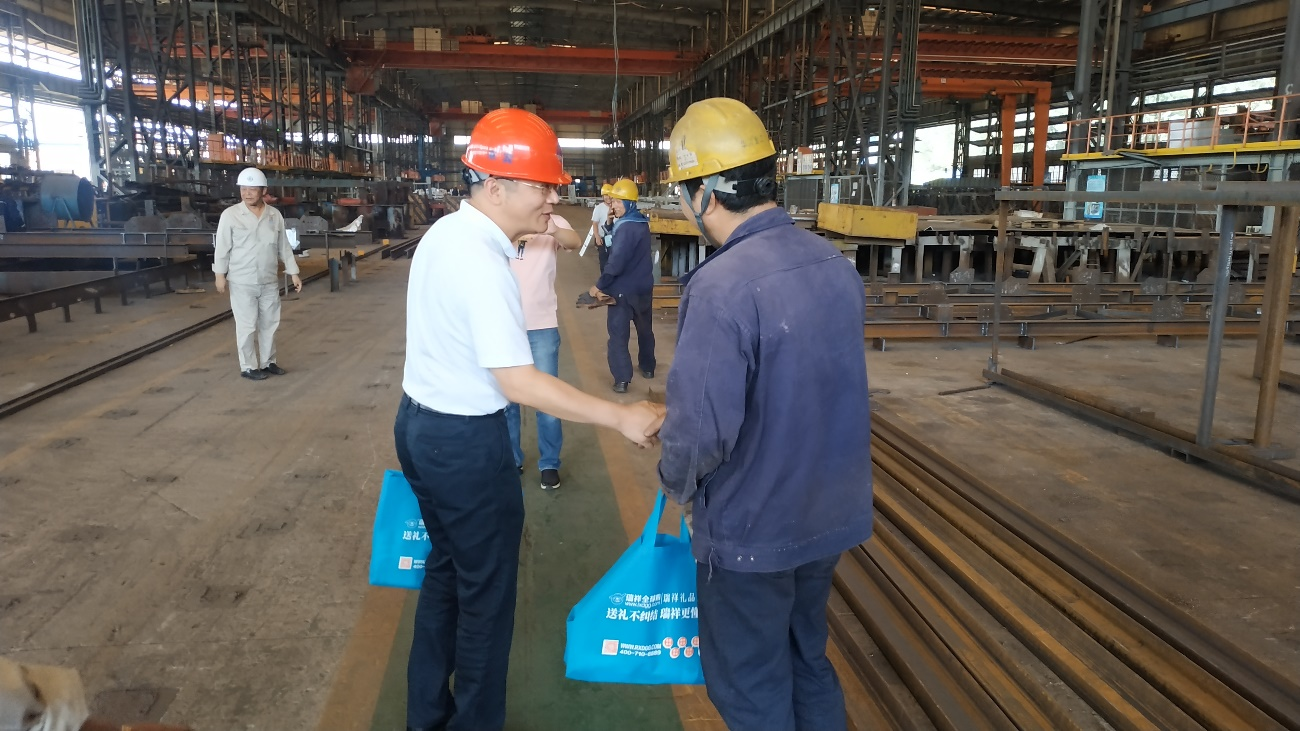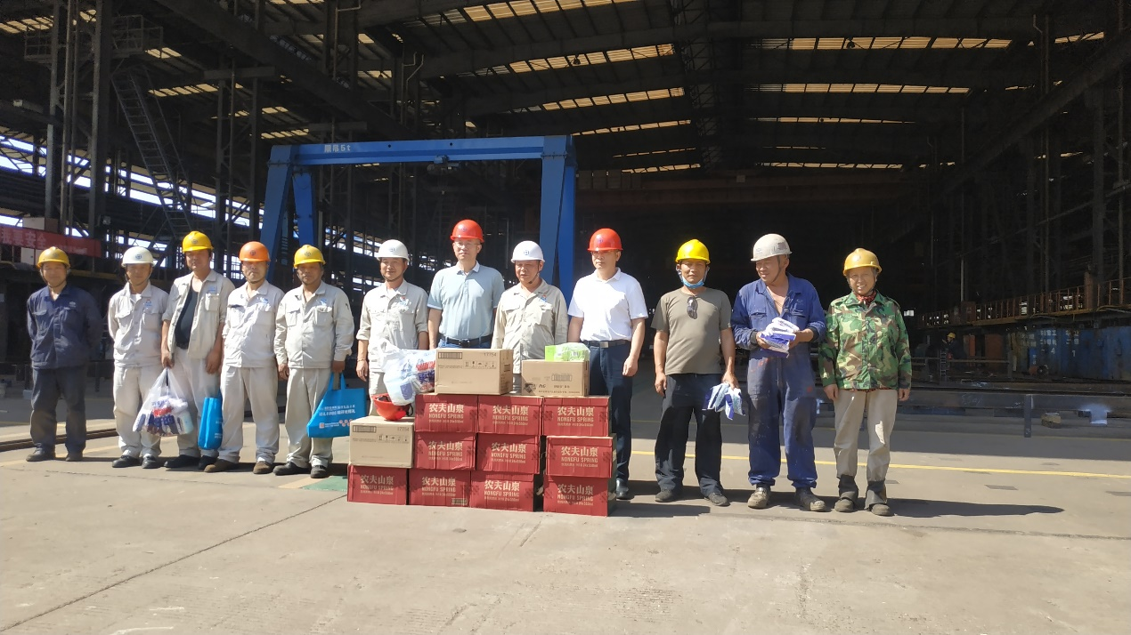 炎炎夏日,连日来气温高温不下,面对持续高温天气,华澄重工全体员工坚守工作岗位,挥洒辛勤与汗水。7月21日下午,江阴—靖江工业园区党委委员、纪委书记刘铭,园区港口事务局副局长费海东一行,来我司慰问坚守在生产一线的员工,为他们送上清凉饮料、毛巾、花露水等消暑用品。公司总经理范选国、副总经理郑红光陪同。