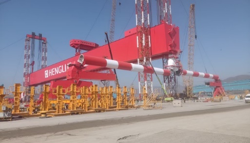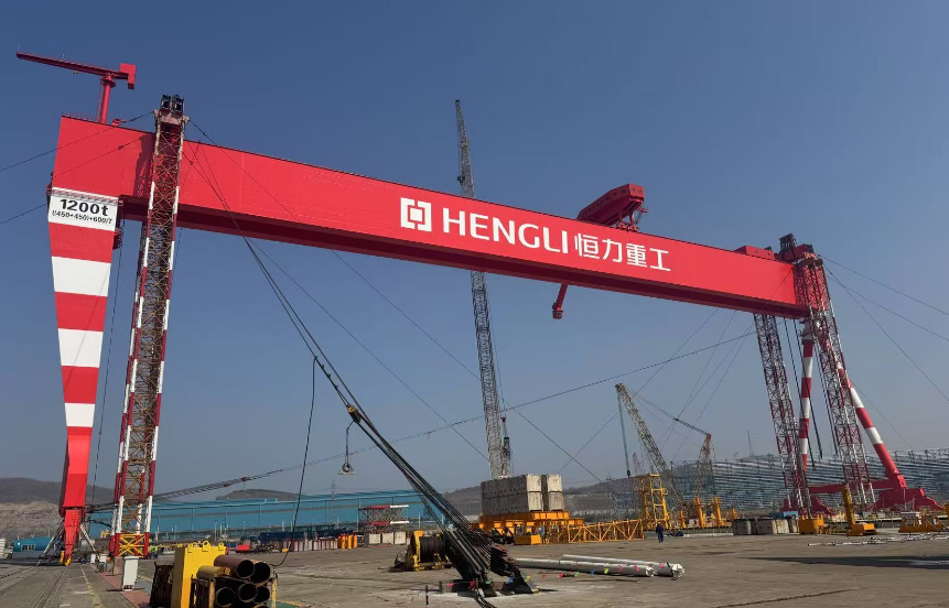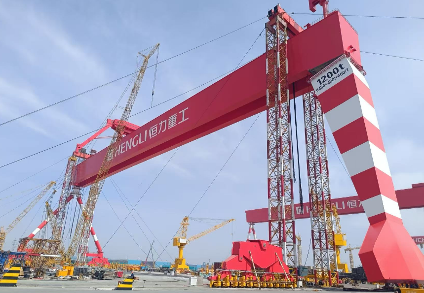 2025年4月1日,大连恒力造船现场再传捷报,继一季度完成恒力造船四台门座机交付后,现场项目团队仅用两个月时间,完成了1200吨超大型龙门吊主结构件合拢组装工作。上午八时十八分,在炮竹声中, 1200吨超大型龙门吊主梁正式开始提升,启动了总装、调试工程。